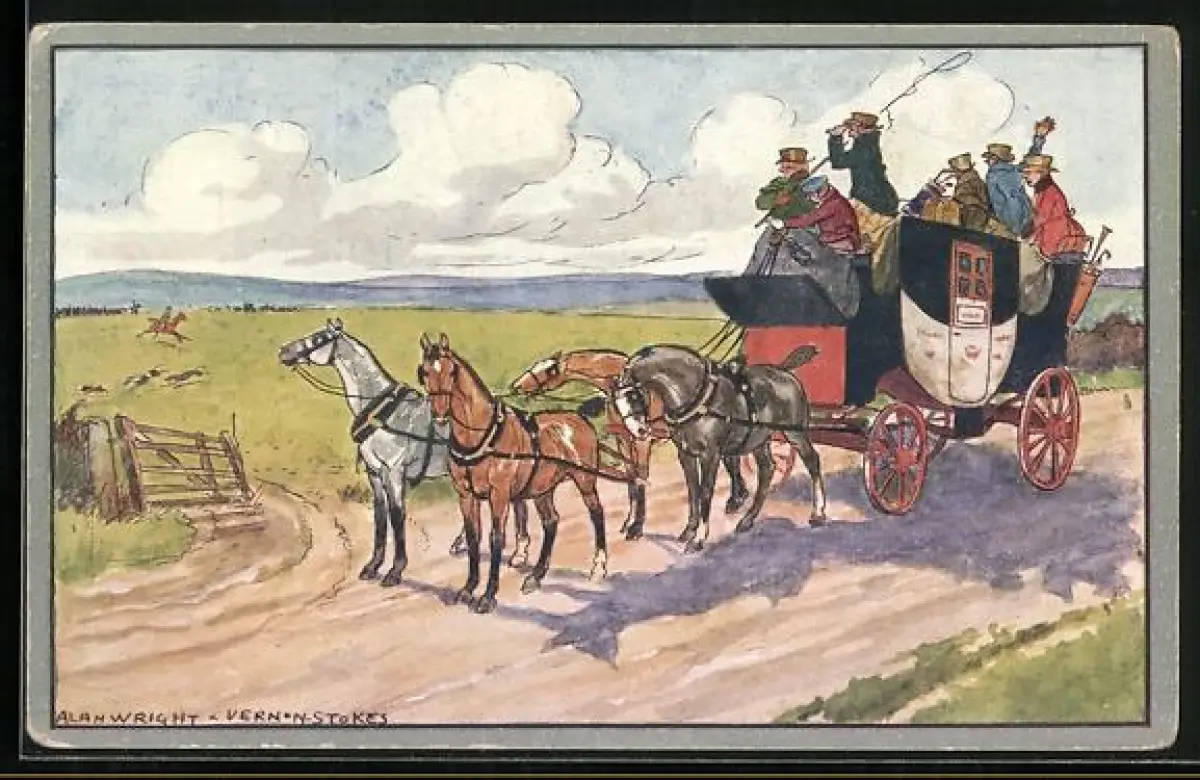 Künstler-AK Passagiere einer Pferdekutsche beobachten eine Treibjagd