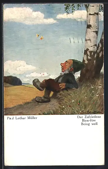 Künstler-AK Paul Lothar Müller: Der zufriedene Zwerg sieht Schmetterlingen zu