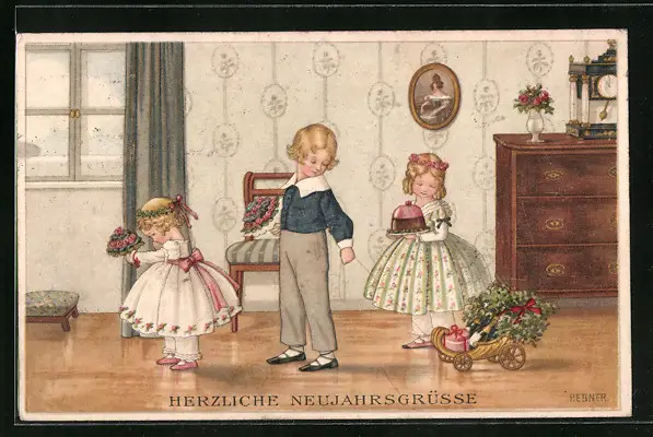 Künstler-AK Pauli Ebner: Junge mit Blumenwagen und zwei Mädchen, Neujahrsgruss