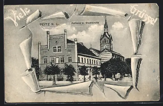 Künstler-AK Peitz /N. L., Rathaus und Stadtkirche