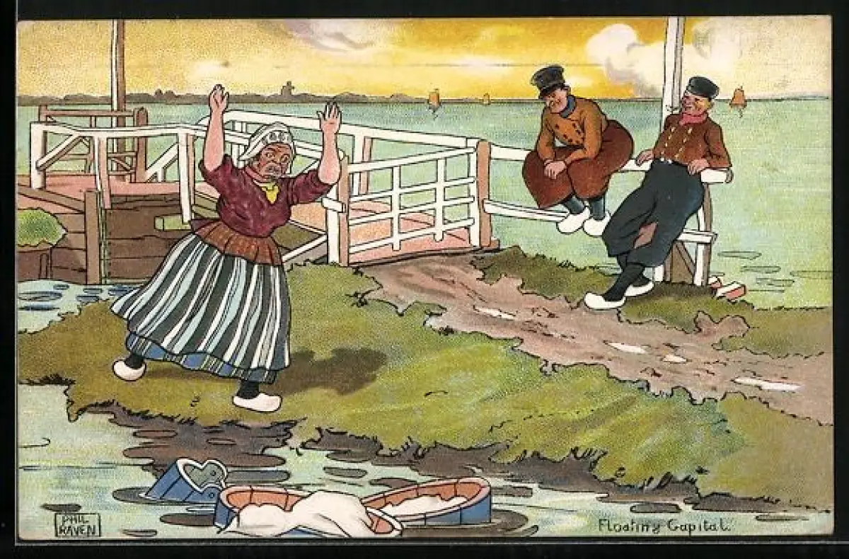 Künstler-AK Phil Raven: Niederländische Männer lachen über hysterische Waschfrau
