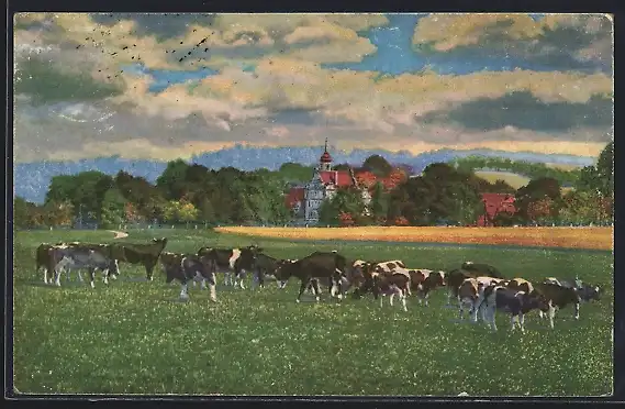 Künstler-AK Photochromie Nr. 304 /1: Weidende Rinder vor der Ortschaft