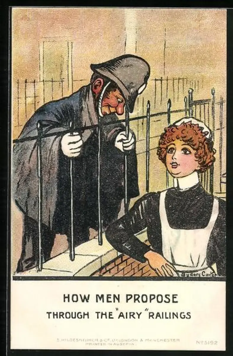 Künstler-AK Polizist schaut zu einem Dienstmädchen herab, How men propose through the airy railings