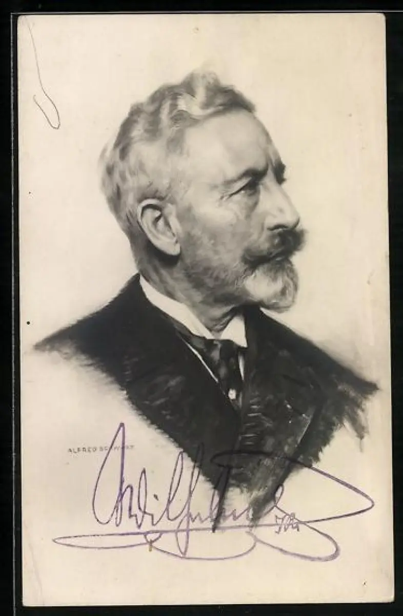 Künstler-AK Porträt Kaiser Wilhelm II. im Anzug, Stempelautograph, Rückseitig Autograph Kaiserin Hermine