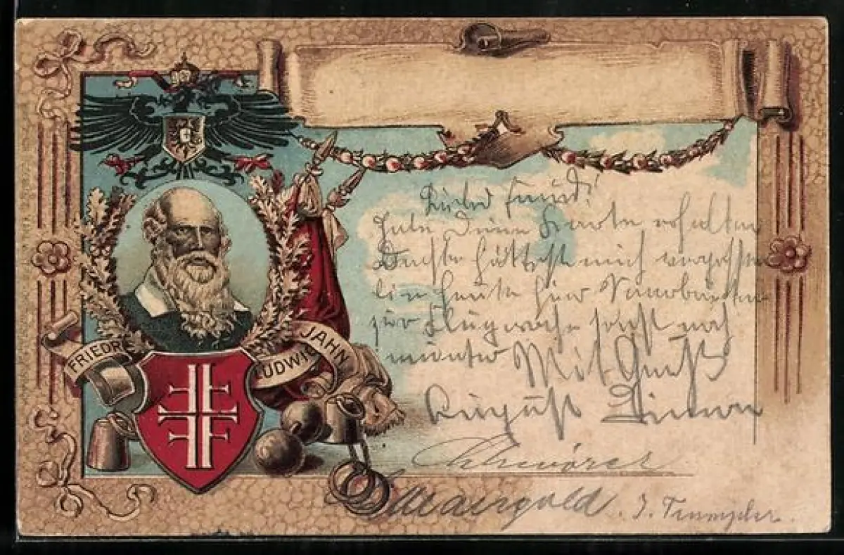 Künstler-AK Porträt vom Turnvater Jahn, Turnerbund-Wappen