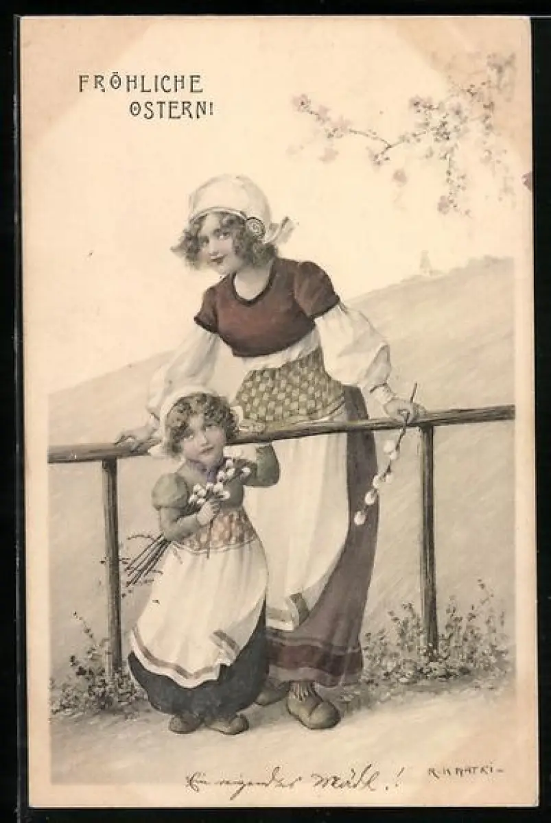 Künstler-AK R. Kratky: Frau und Tochter mit Weidenkätzchenzweig