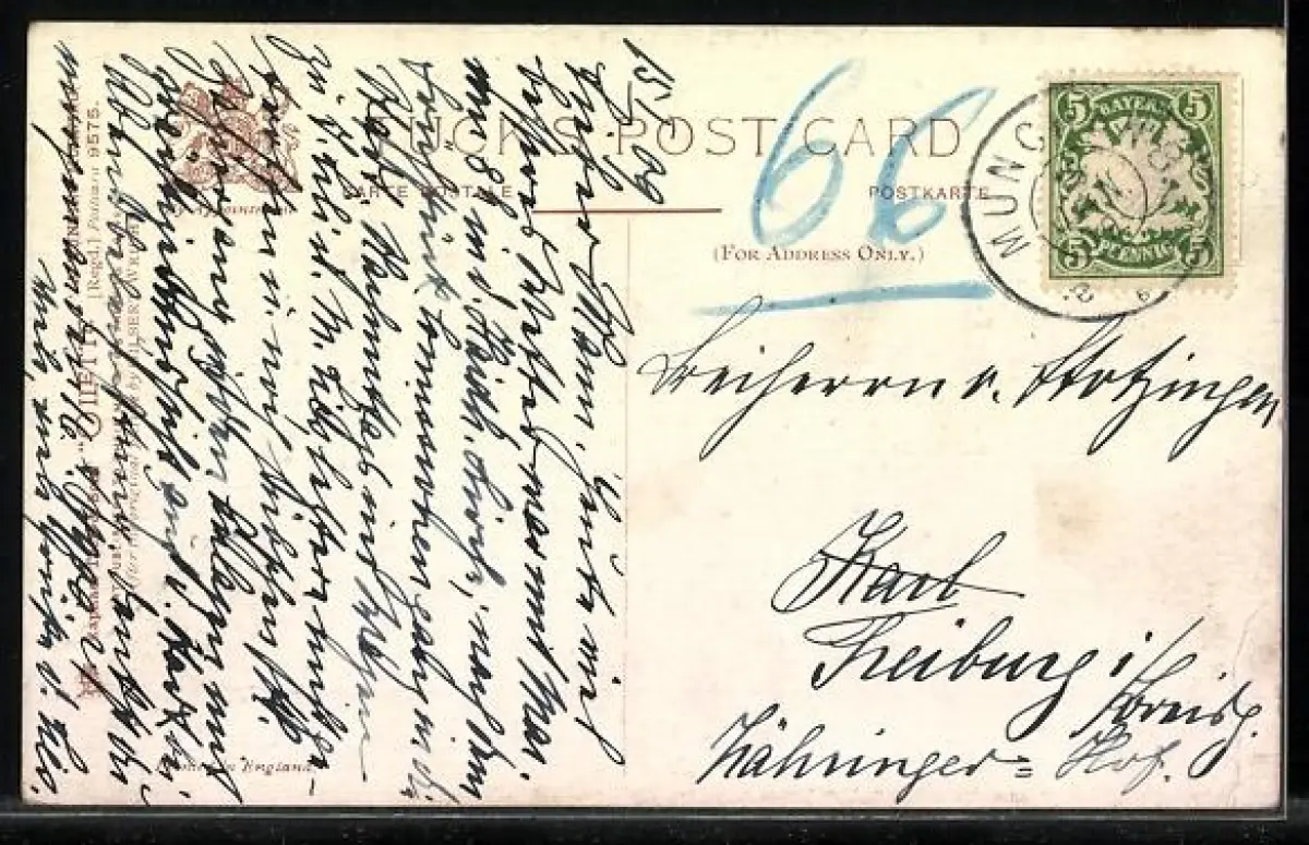 Personenbezogene Daten auf der Rückseite der Karte wurden durch blauen Textmarker unkenntlich gemacht. Die blauen Stellen sind auf die Vorderseite durchgeweicht und wirken sich negativ auf das Postkartenfoto aus