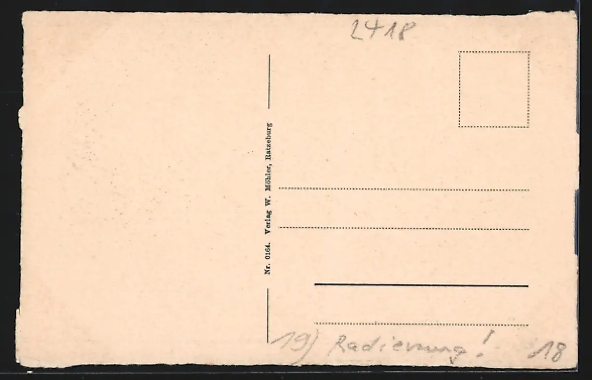 Personenbezogene Daten auf der Rückseite der Karte wurden durch blauen Textmarker unkenntlich gemacht. Die blauen Stellen sind auf die Vorderseite durchgeweicht und wirken sich negativ auf das Postkartenfoto aus