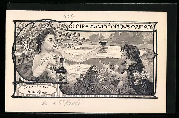 Künstler-AK Reklame für Wein von Gaston Gérard, Dame reicht einem Mädchen ein Weinglas, Jugendstil