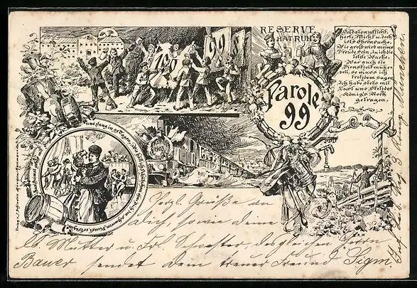 Künstler-AK Reserve Hat Ruh, Parole 99, Reservisten in Uniformen mit Bier