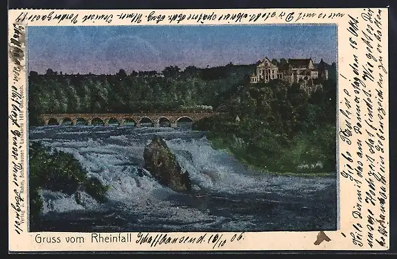 Künstler-AK Rheinfall, Ortspartie mit Wasserfall