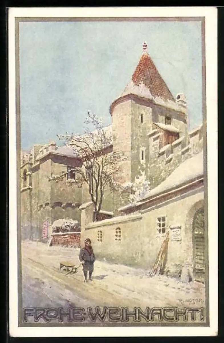 Künstler-AK Richard Moser: Weihnachtsgruss, Junge mit Schlitten auf einer verschneiten Strasse