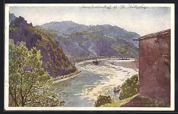 Künstler-AK Rudolf Schmidt: St. Nikola an der Donau, Donauwinkel