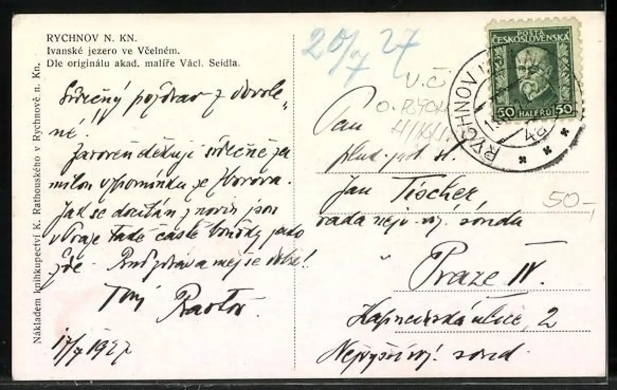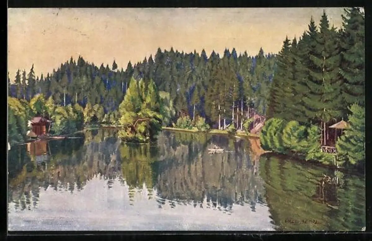 Künstler-AK Rychnov n. Kn., Ivanské jezero ve Vcelném, Dle originálu akad. Malíre Václ. Seidla