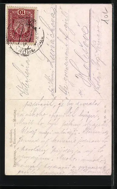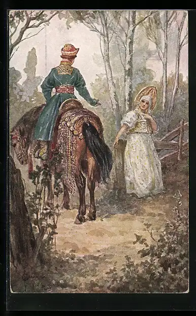 Künstler-AK S. Solomko: Reiter erblickt eine Frau am Wegesrand, Begegnung