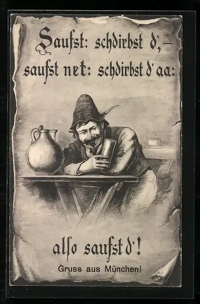 Künstler-AK Saufst: Sschdirbst d`... - Zecher philosophiert am Tisch
