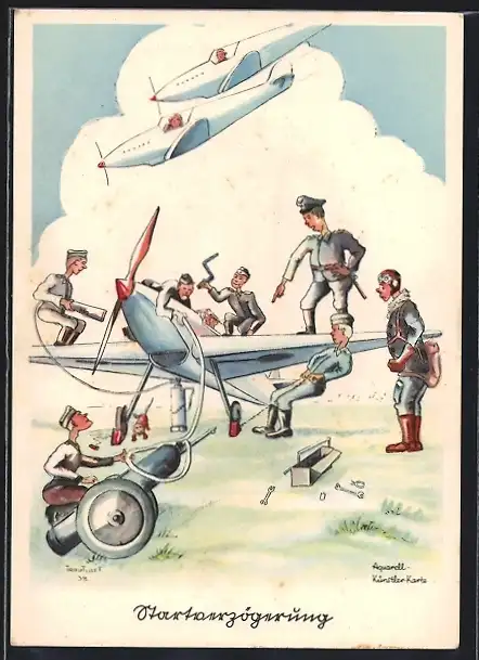Künstler-AK Serie Flieger-Humor, Startverzögerung
