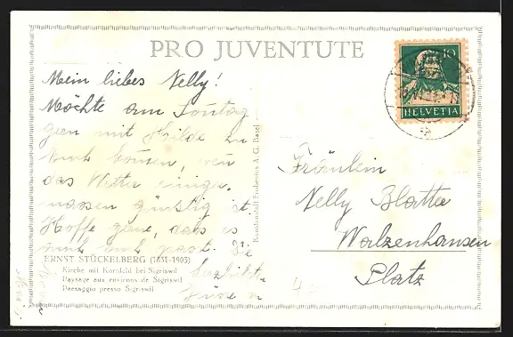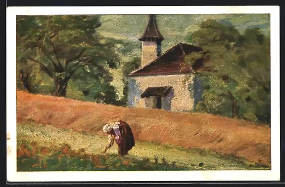 Künstler-AK Sigriswil, Kirche mit Kornfeld und Bäuerin, Pro Juventute