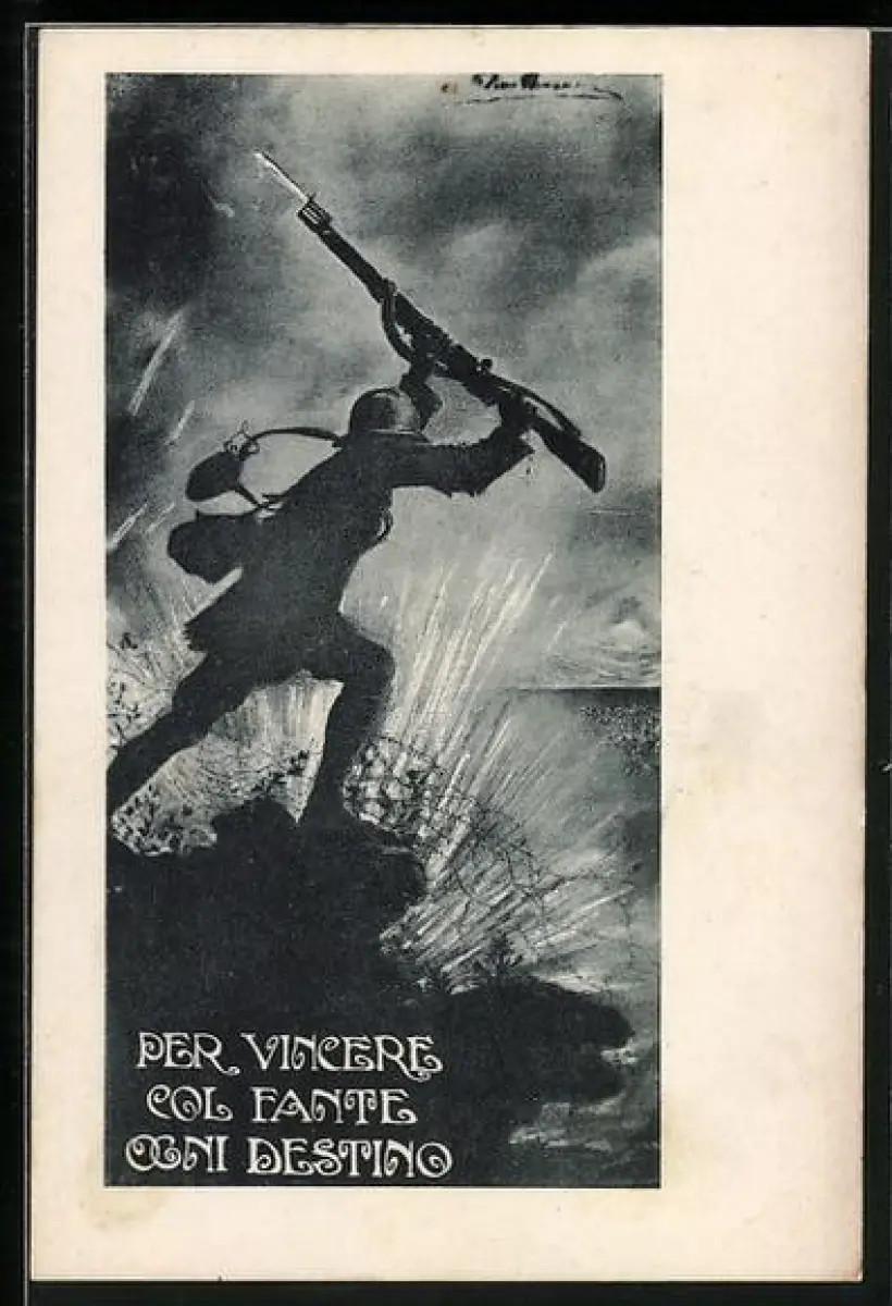 Künstler-AK Soldat in Uniform vor einer Explosion, Per Vincere Col Fante Ocni Destino