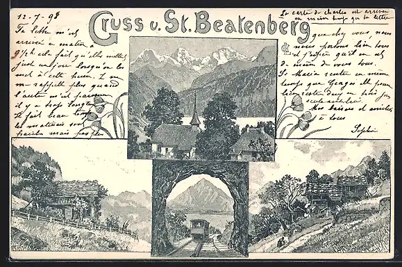 Künstler-AK St. Beatenberg, verschiedene Ansichten, Kirche mit Bergpanorama, Bahn vor einem Tunnel