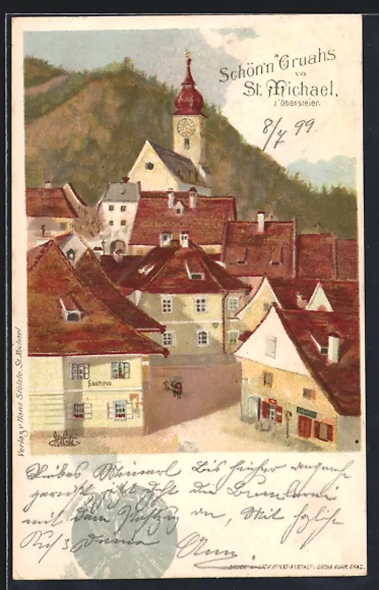 Künstler-AK St. Michael /Obersteiermark, Ortsansicht mit Kirche