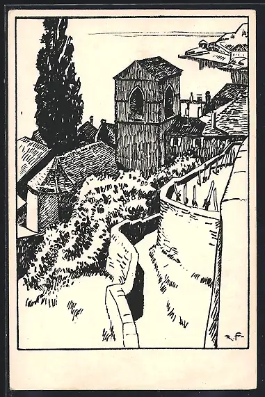 Künstler-AK St. Saphorin, Kirche von oben