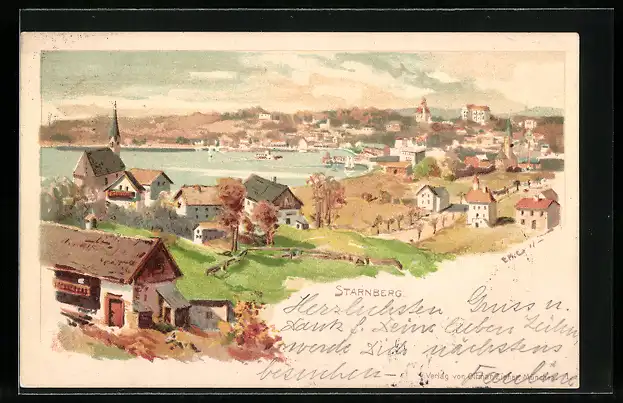 Künstler-AK Starnberg, Gesamtansicht mit der Kirche