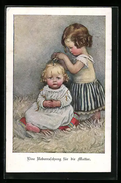 Künstler-AK Susan Beatrice Pearse: Eine Überraschung für die Mutter, Mädchen schneidet Schwesterlein die Haare