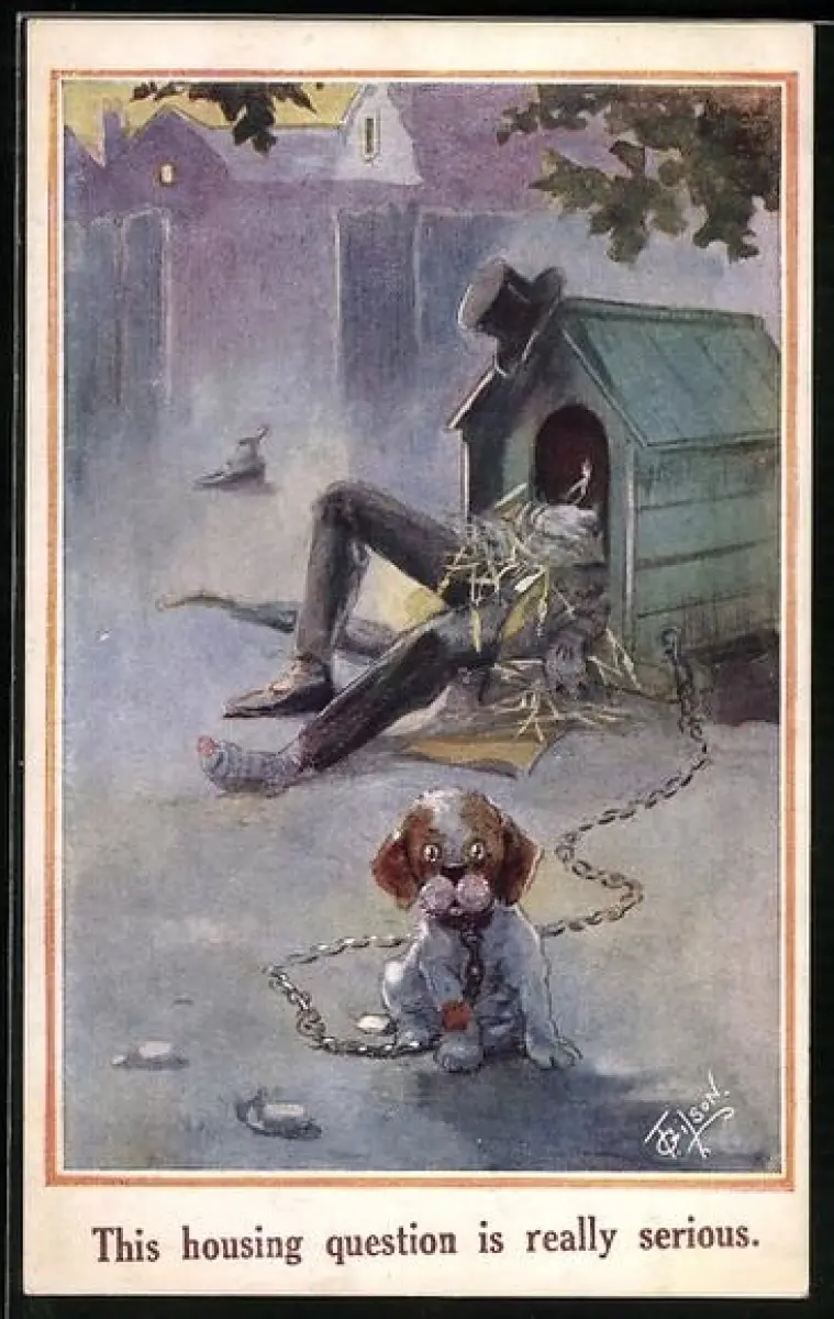 Künstler-AK T. Gilson: Mann schläft in einer Hundehütte
