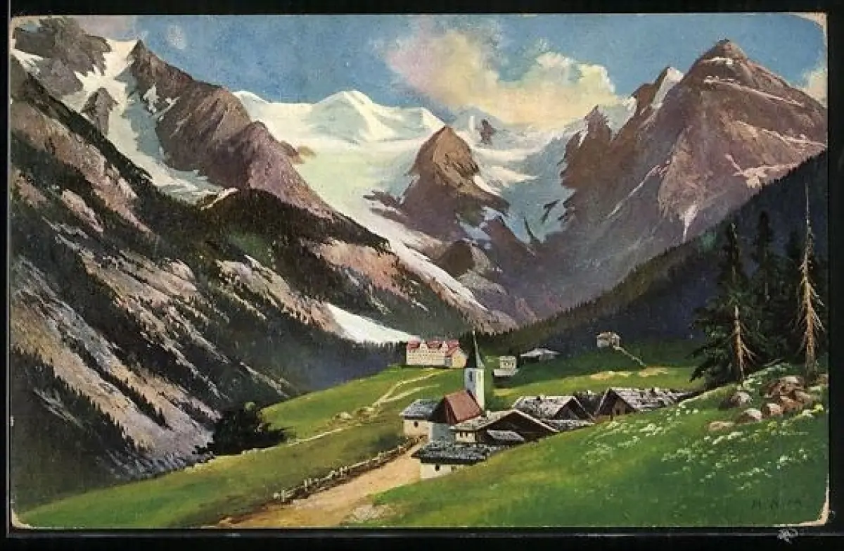 Künstler-AK Trafoi, Teilansicht mit Ortler