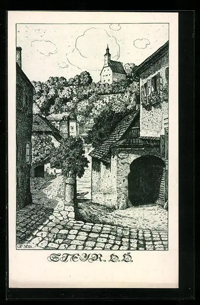 Künstler-AK Ulf Seidl: Steyr, Strassenpartie