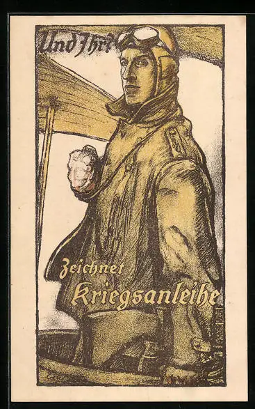 Künstler-AK Und ihr? Zeichnet Kriegsanleihe, Pilot mit geballter Faust