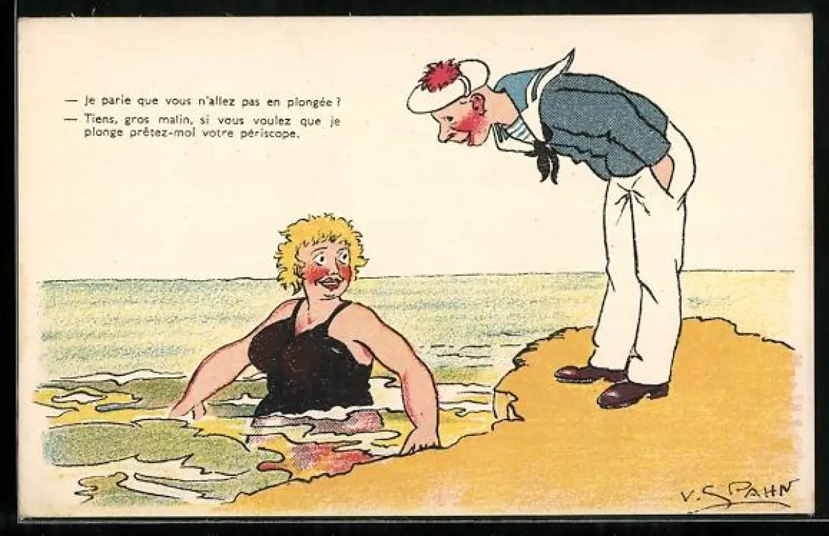 Künstler-AK V. Spahn: Frau badet im wasser während sie von einem Jungen angesprochen wird