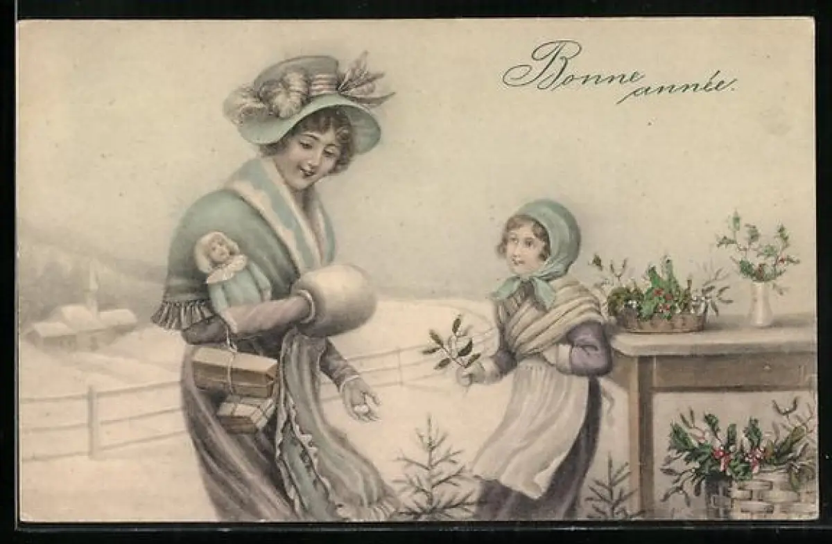 Künstler-AK V.K., Vienne Nr. 5003 /a: Mutter und Tochter mit Puppe und Mistelzweig im Arm