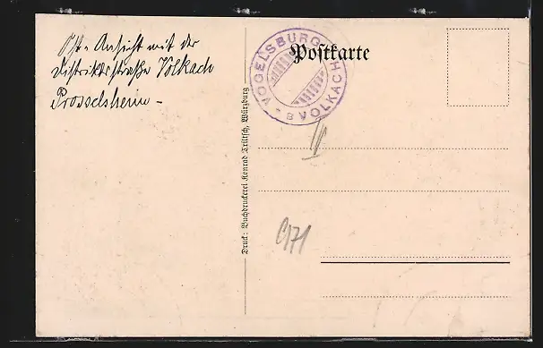 Personenbezogene Daten auf der Rückseite der Karte wurden durch blauen Textmarker unkenntlich gemacht. Die blauen Stellen sind auf die Vorderseite durchgeweicht und wirken sich negativ auf das Postkartenfoto aus