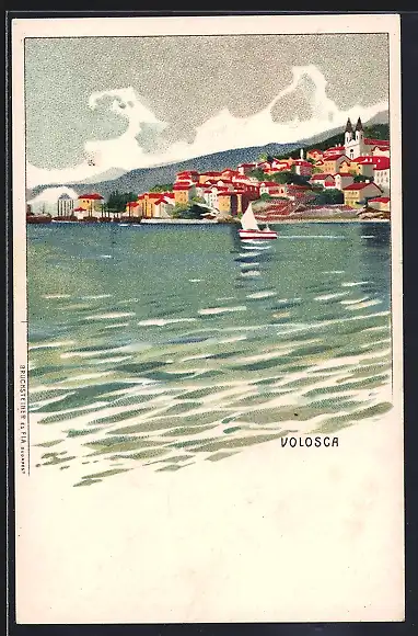 Künstler-AK Volosca, Uferpartie mit Blick zum Segelboot
