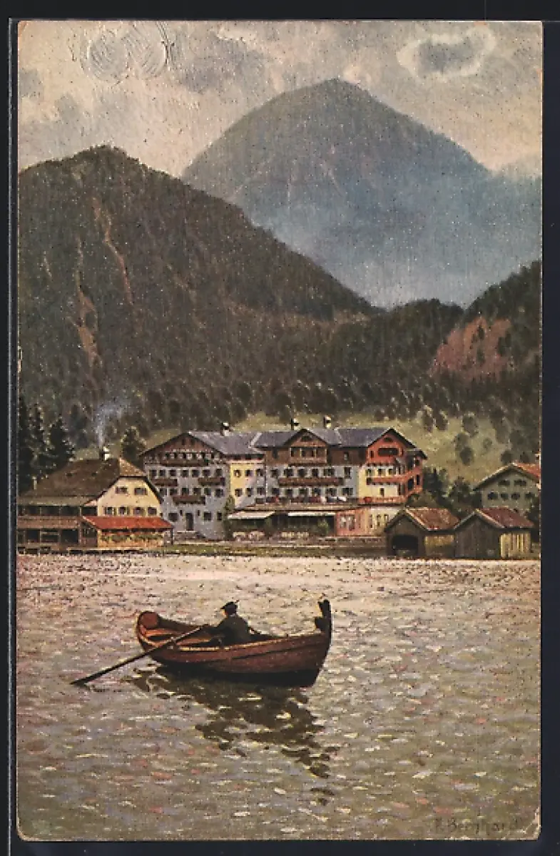 Künstler-AK Walchensee, Ruderboot auf dem See mit Ortsansicht & Alpenpanorama