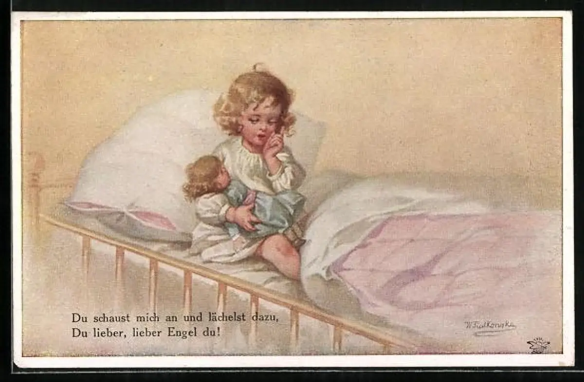 Künstler-AK Wally Fialkowska: Du schaust mich an und lächelst dazu..., Kind mit Puppe