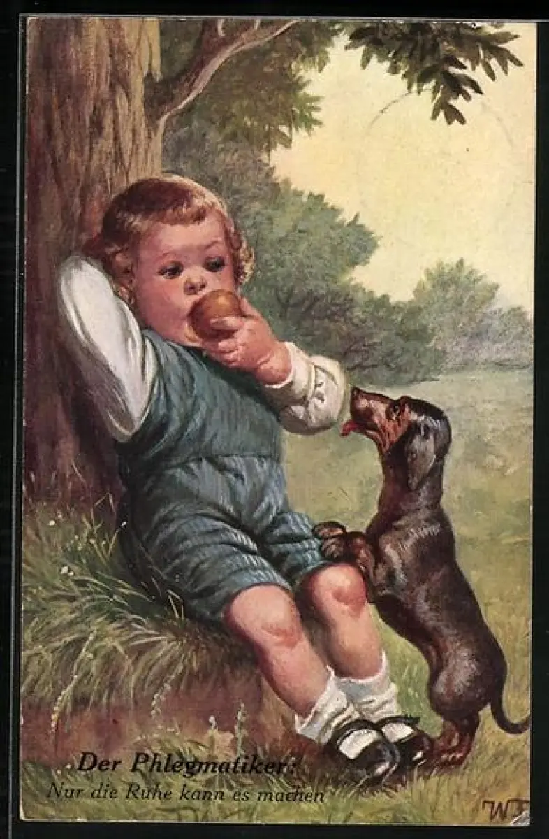 Künstler-AK Wally Fialkowska: Kleiner Junge isst Apfel, Dackel schaut zu