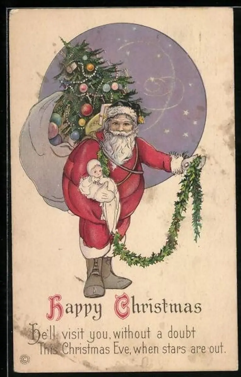 Künstler-AK Weihnachtsmann mit schwerem Sack auf dem Rücken trägt ein Baby im Arm