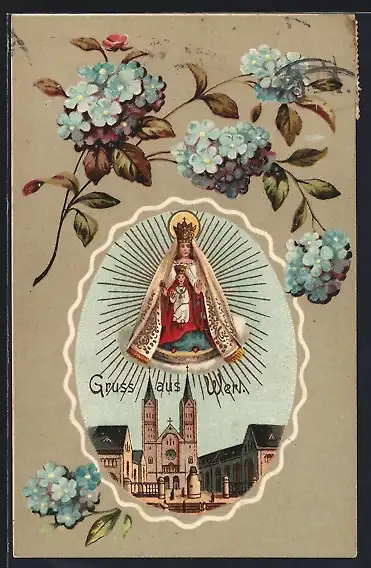 Künstler-AK Werl, Kirche, Gnadenmutter, blaue Blumen