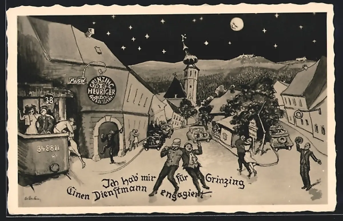 Künstler-AK Wien-Grinzing, Ortspartie mit Gasthaus aus der Sicht eines Betrunkenen