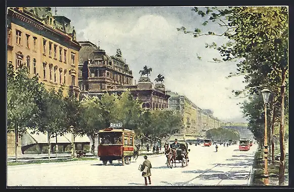 Künstler-AK Wien I, Opernring mit Pferdebahnen
