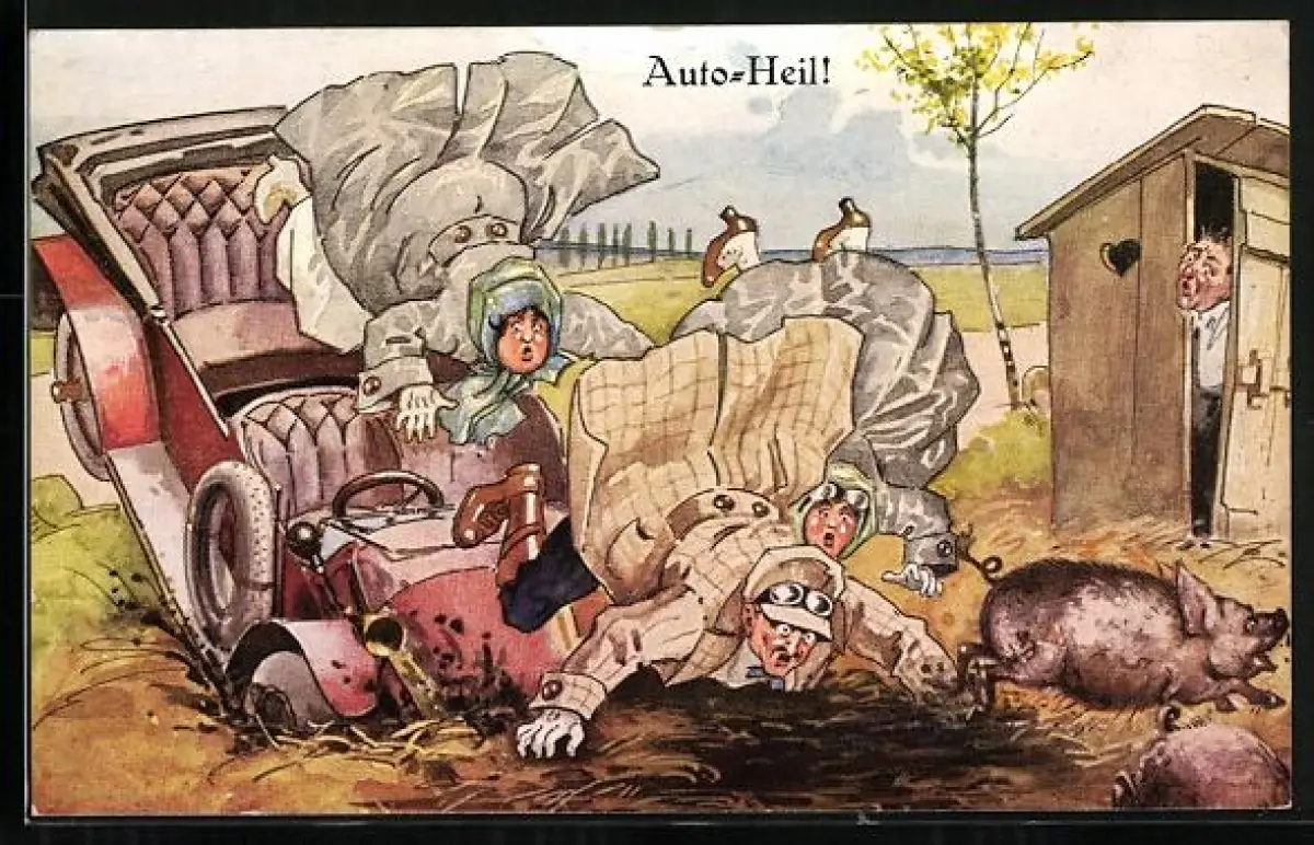 Künstler-AK Wilde Autofahrt endet in einer Schweinesuhle