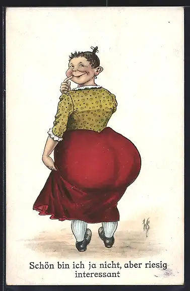 Künstler-AK Willi Scheuermann: Dicke Frau findet sich riesig interessant