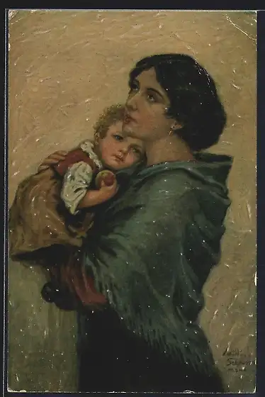 Künstler-AK Willi Scheuermann: Vaterlos, Mutter mit Kleinkind auf dem Arm