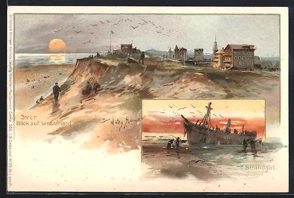 Künstler-AK Willy Stoewer: Sylt, Blick auf Westerland, Strandgut