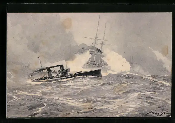 Künstler-AK Willy Stoewer: Torpedoboots-Angriff in der Nordsee bei unruhiger See
