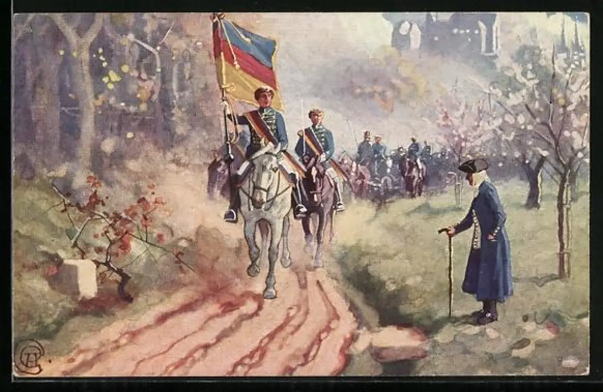 Künstler-AK Wohlauf, die Luft geht frisch und rein..., reitende Burschenschaft