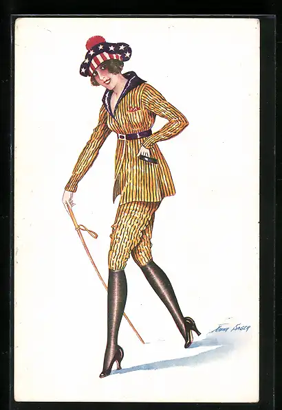 Künstler-AK Xavier Sager: Dame in gestreiftem Anzug mit Gehstock